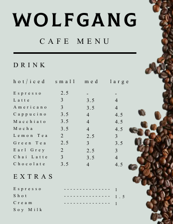 You can make a restaurant menu using PosterMyWall. Select from over 1,720+ coffee menu design templates and customize them to make it your own by adding your logo, text, and images or videos. You can use the menu maker tool to add and save a list of the items on your menu, ready to use in various restaurant menu designs.